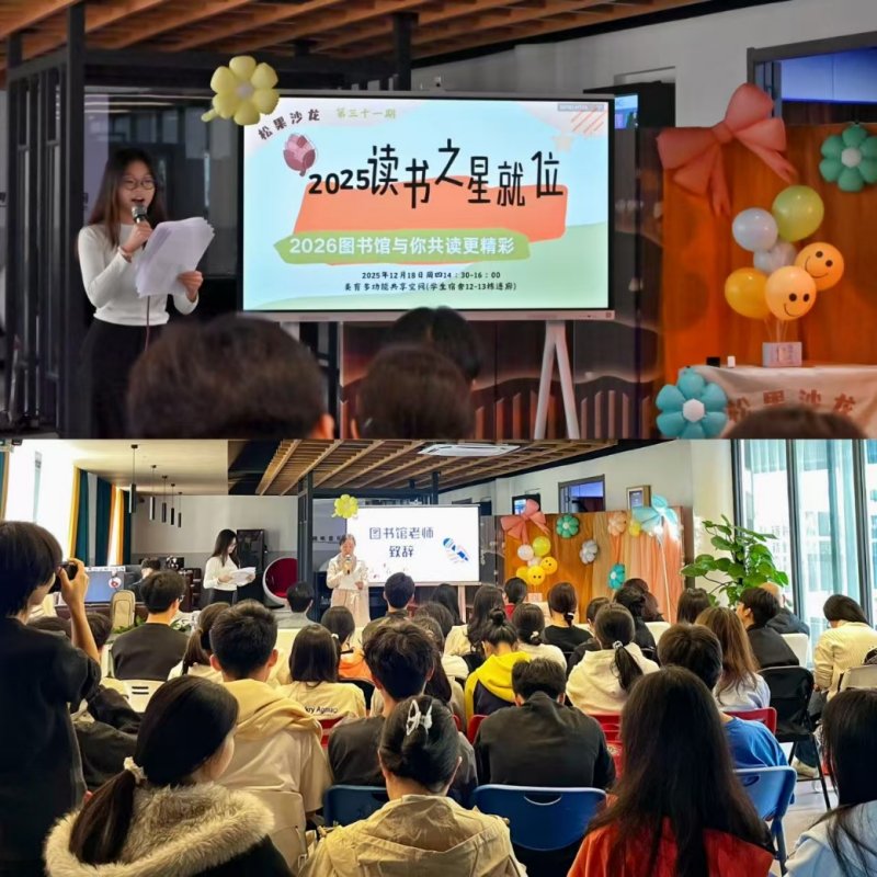活动伊始,主持人娓娓道来本次沙龙的初衷与意义,着重强调阅读对个人成长、思维拓展的深远价值。图书馆读者服务部老师登台作开场致辞,言语恳切地鼓励同学们以“借阅之星”为榜样,真正爱上阅读、坚持阅读,以书为友,在墨香氤氲中沉淀自我、涵养心性。随后,现场通过一段精彩的回顾视频,再现了本年度图书馆松果沙龙、时钟读书会等品牌活动的温馨瞬间,唤起了师生们的共同回忆。在热烈的掌声中,主持人隆重揭晓2025年度“借阅之星”获奖名单,图书馆老师依次为获奖同学颁奖,见证这份属于爱书人的荣耀。
