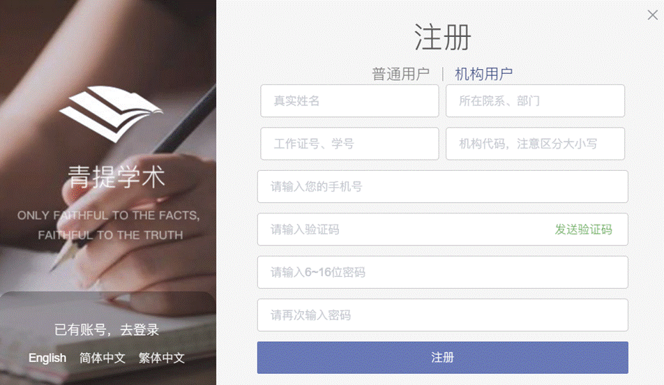 本校师生使用青提学术须进行机构用户注册,机构代码为“GDKFDX”,注册并在机构IP范围内认证成功后,方可享受本校拥有的机构特权。